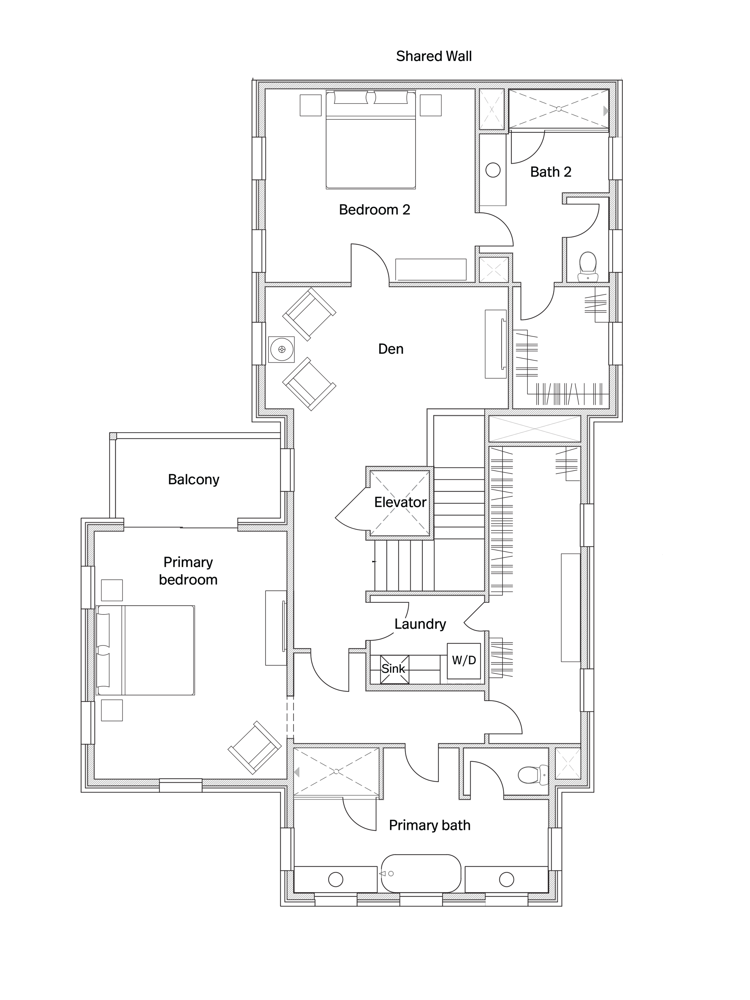 Interior walls at bedrooms, bathrooms, laundry rooms, offices, and elevators