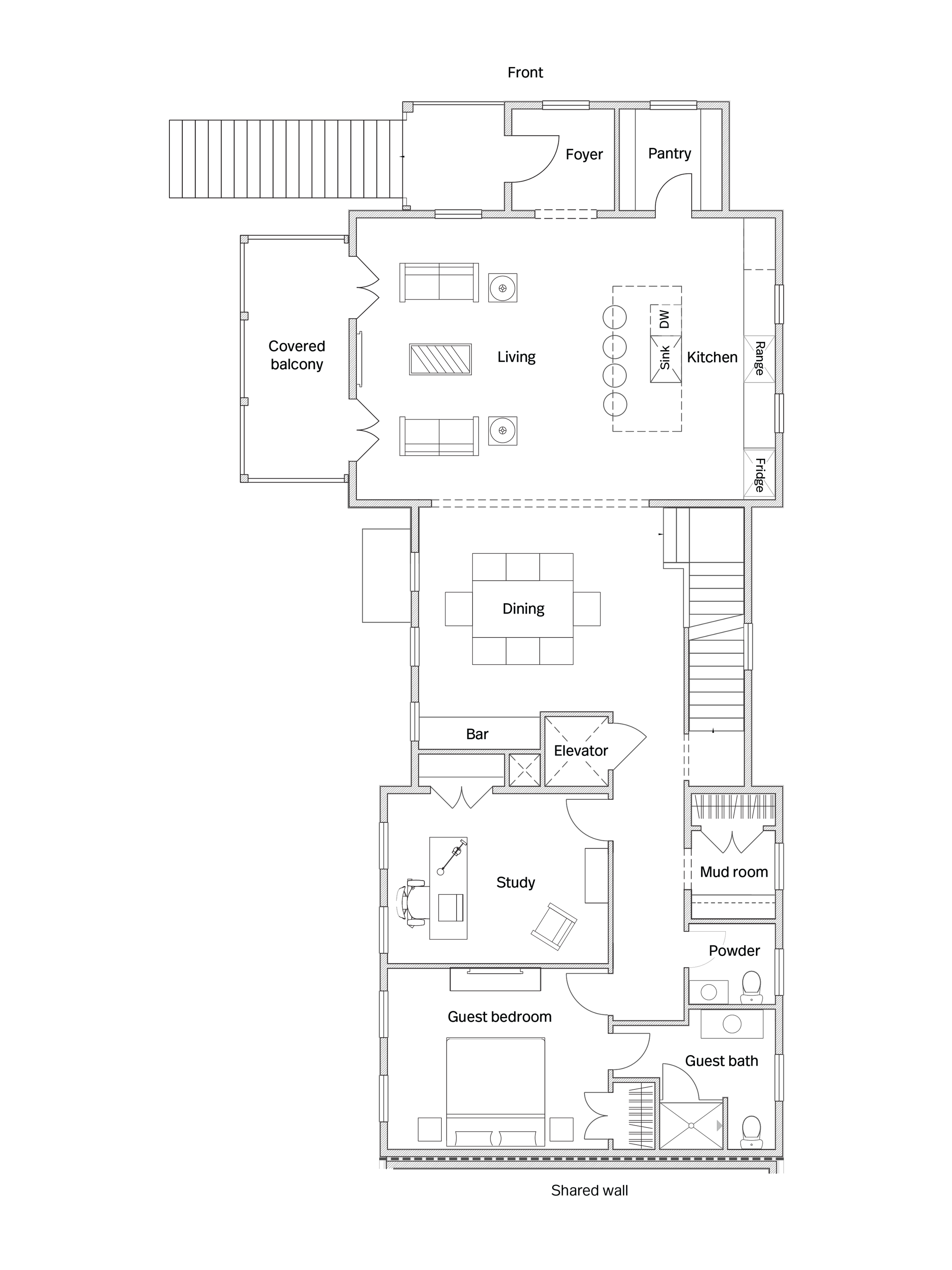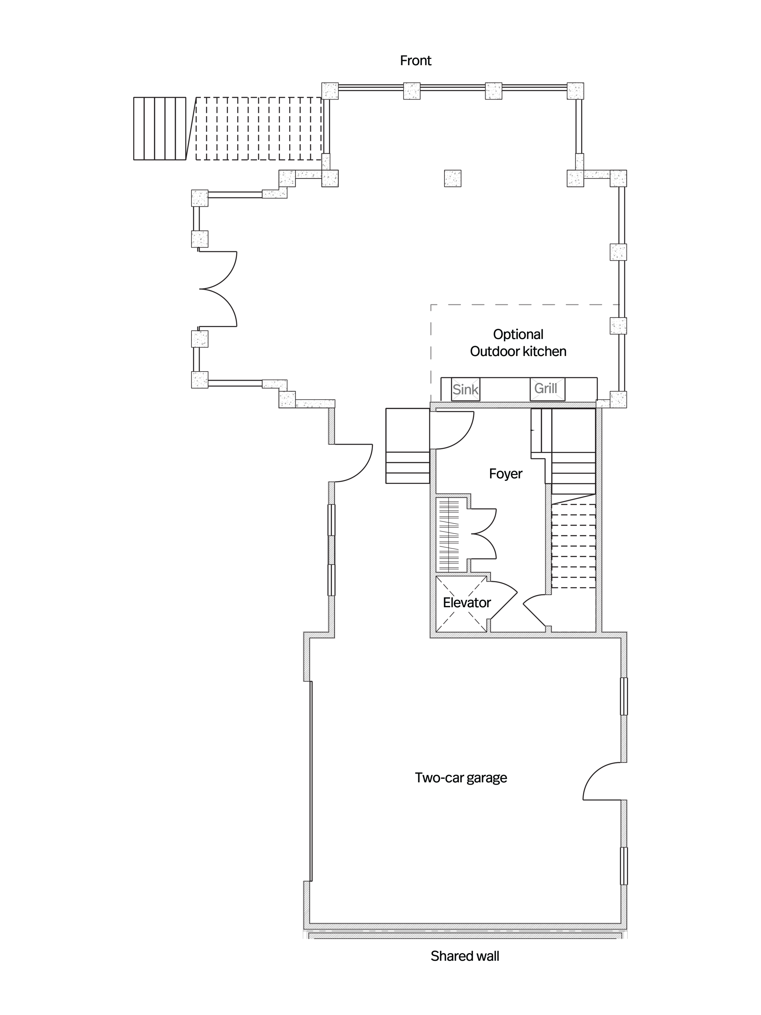 1 powder bath, 2-car garage, elevator